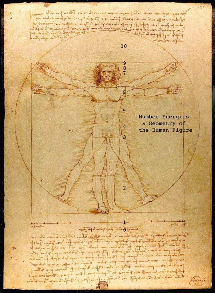 The energy of the number two goes to the two legs. The energy of the number three goes to the triangular pelvis region, and focalizes at the base chakra. The energy of the number four goes to the square lower abdominal region, focalizing at the second chakra. The energy of five goes to the diaphragm and focalizes at the Solar Plexus. The energy of the number six goes to the chest, as well as the throat, and focalizes at both the heart and throat chakras. The energy of seven goes to the face beneath the brow ridge, and focalizes at the point between the eyebrows. The energy of the number eight goes to the forehead and focalizes at the brow chakra. The energy of nine goes to the top of the head and the crown chakra. Ten, as already stated, goes to the above the head transpersonal chakra. This yields the attractive and very tangible symbolism of 10 and 1 representing heaven and earth, respectively (and the parts of us rooted in them), and the numbers 2-9 spanning these in the finite human form.